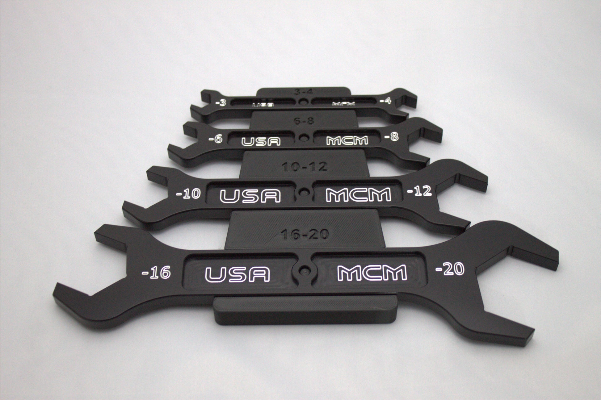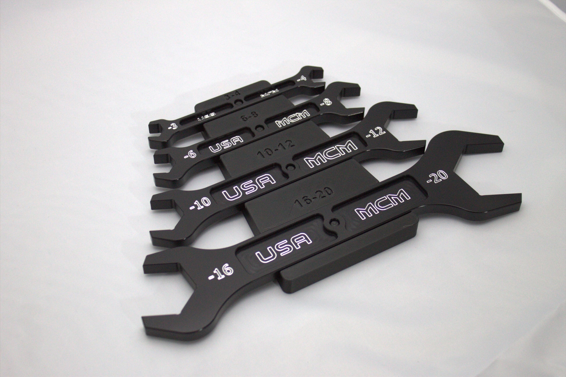 The MCM AN wrench set features long bodies with smooth contours and rounded edges. An ergonomic design makes them as comfortable as they are useful and aesthetic. Finished in black anodize for durability. Contrast cut engraving makes it easy to identify sizes.